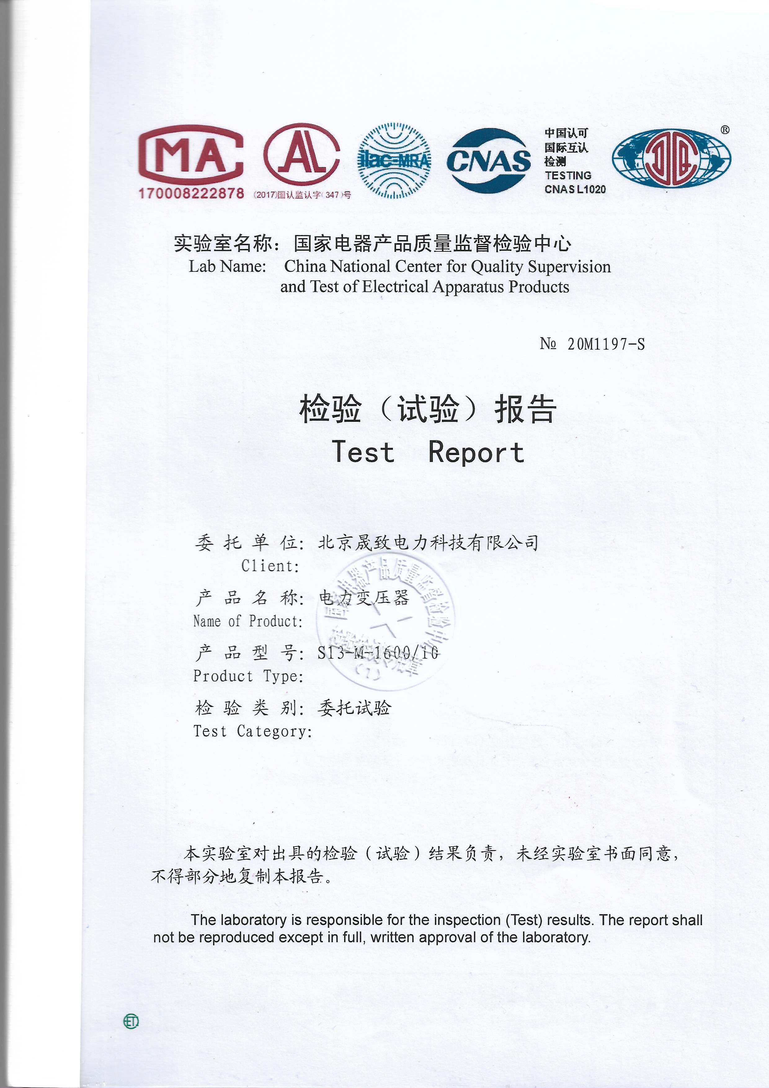 經(jīng)過一系列的相關試驗后,蘇高所于2020年08月對送檢產品作出以下檢驗結論:電力變壓器(型號:S13-M-1600/10)例行試驗、型式試驗、 壓力變形試驗、三相變壓器零序阻抗測量、空載電流諧波測量的試驗結果符合檢驗依據(jù)標準和委托書要求,樣品上述試驗合格,并出具相關型式試驗報告認定。