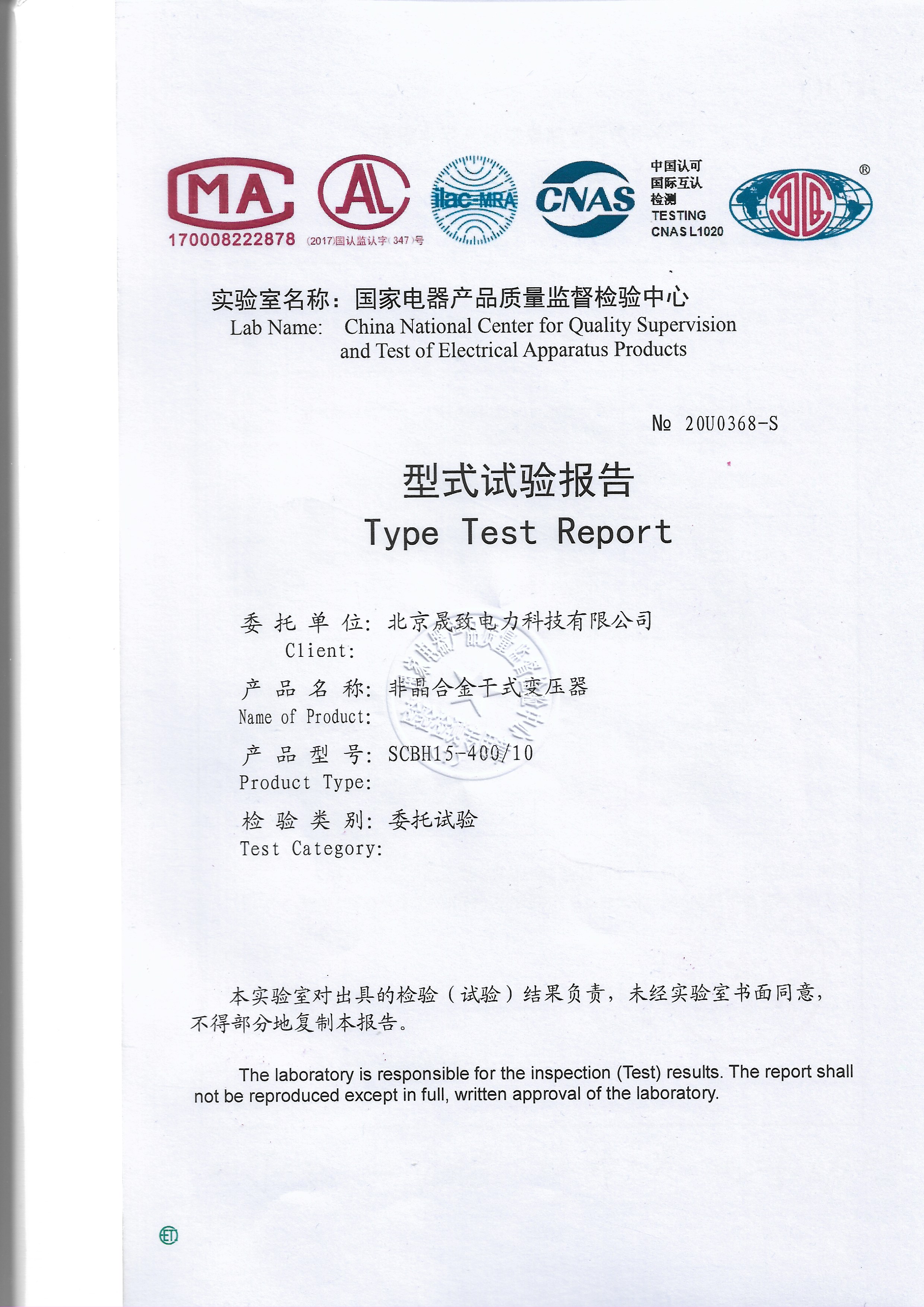 2020年08月,北京晟致電力科技有限公司生產(chǎn)的SCBH15-400/10非晶合金干式變壓器送樣至國家電器產(chǎn)品質(zhì)量監(jiān)督檢驗中心-蘇州電器科學(xué)研究院(以下簡稱“蘇高所”),委托蘇高所對產(chǎn)品進行型式試驗檢測。
